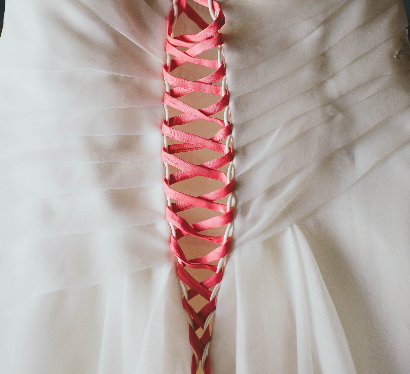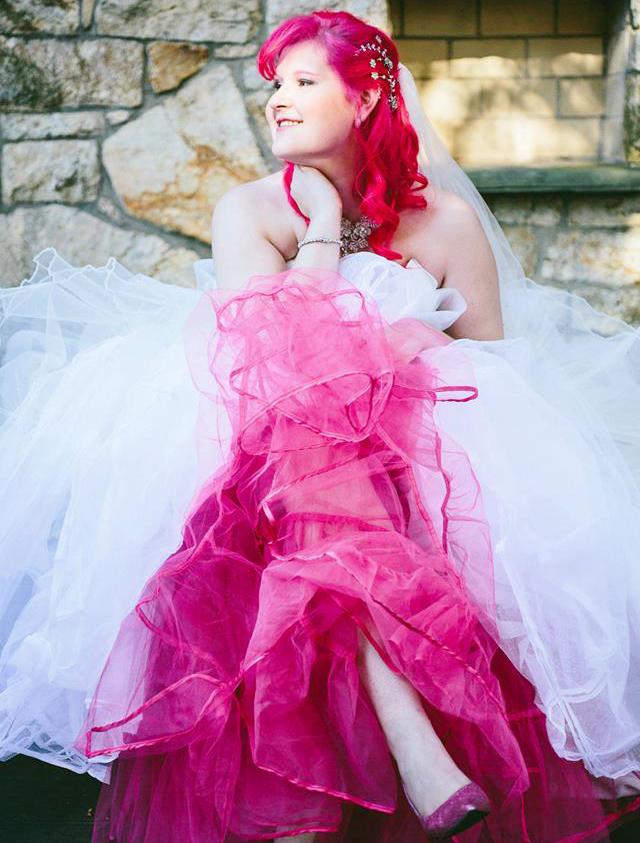 The Brides dress was purchased at a boutique, but she replaced the corset strings with hand-sewn ones to match her hair. She also added over 4000 rhinestones on the hem of her dress. The shoes were glittered and more than 300 rhinestones were added to the heals. I also added two petticoats, one big white one for volume, and a ruffly hot pink one for some extra color pop! While I didn’t make the petticoats myself (The pink one was provided by Pettiskirt Style), it was quite a DIY project to make the dress come together as a coherent ensemble.