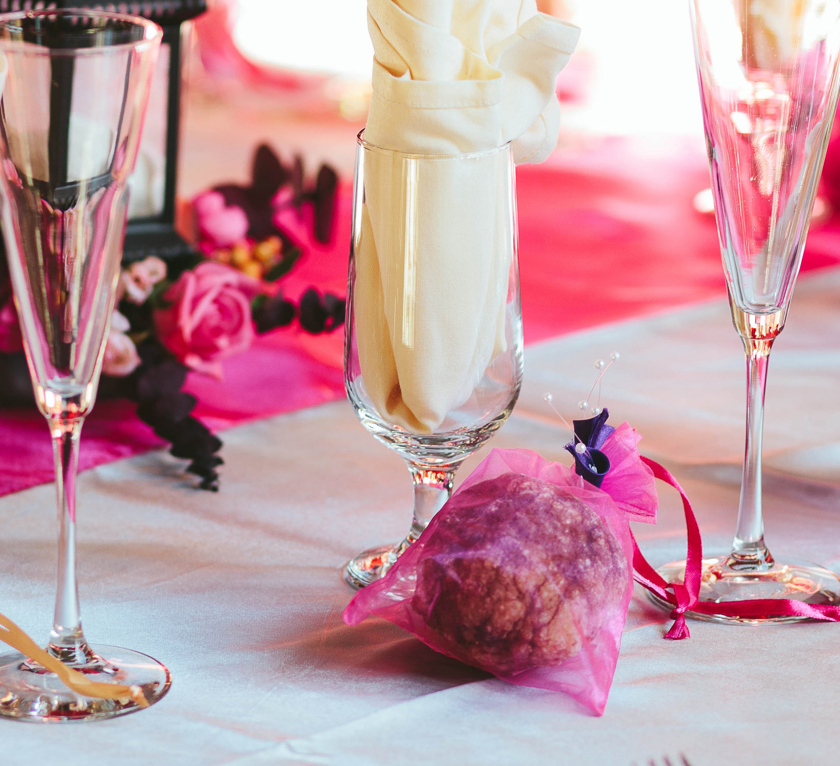 The favors were inspired by our love of rocks. What appears to be a big boring rock inside a sheer sachet is actually a geode. Instructions inside the baggie instruct the guest to smash the rock with a hammer, to reveal the beautiful crystals inside.