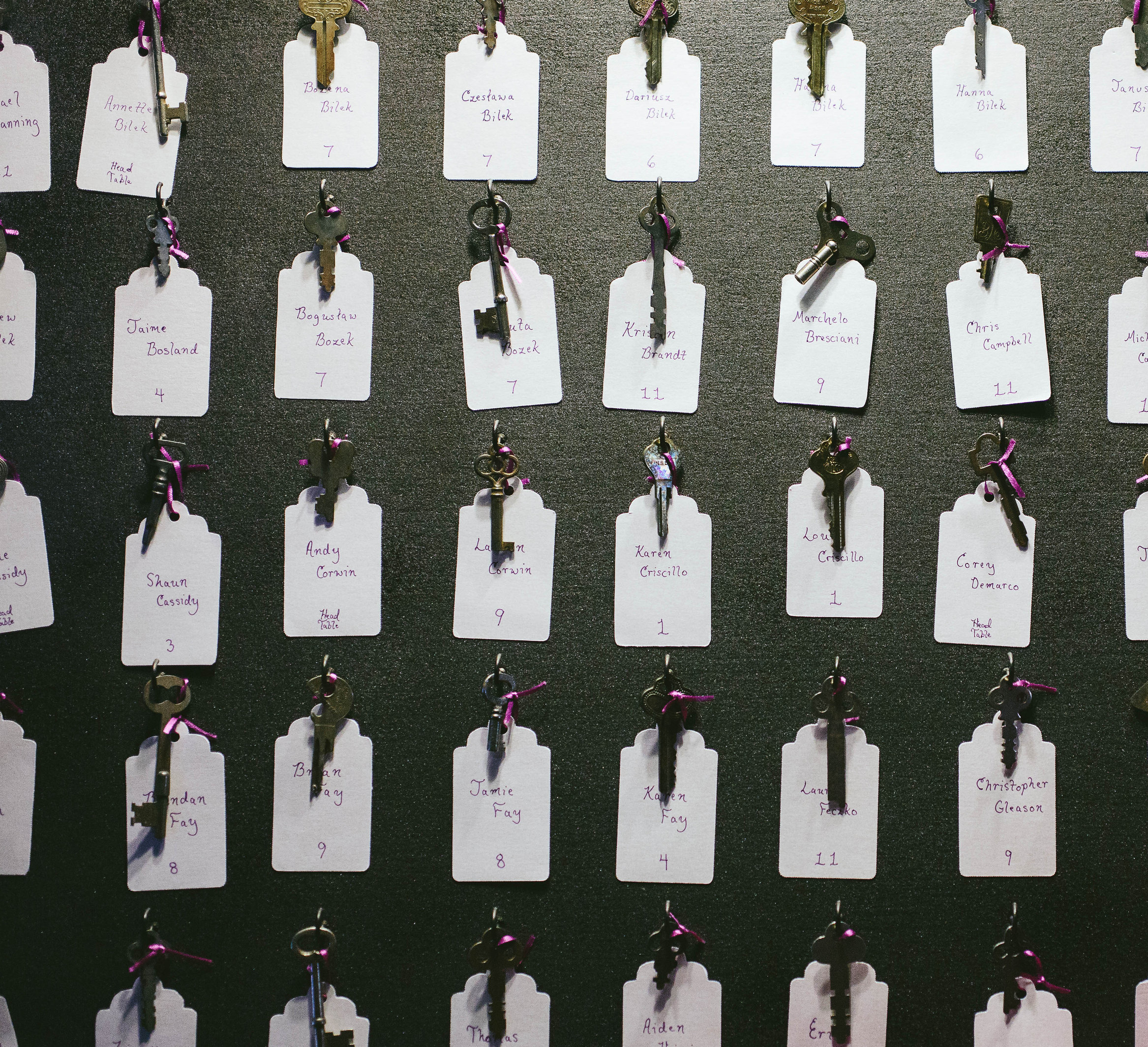 Instead of folded cards, we opted to take over a hundred genuine antique skeleton keys and string them to tags with each guests’ name and table number.